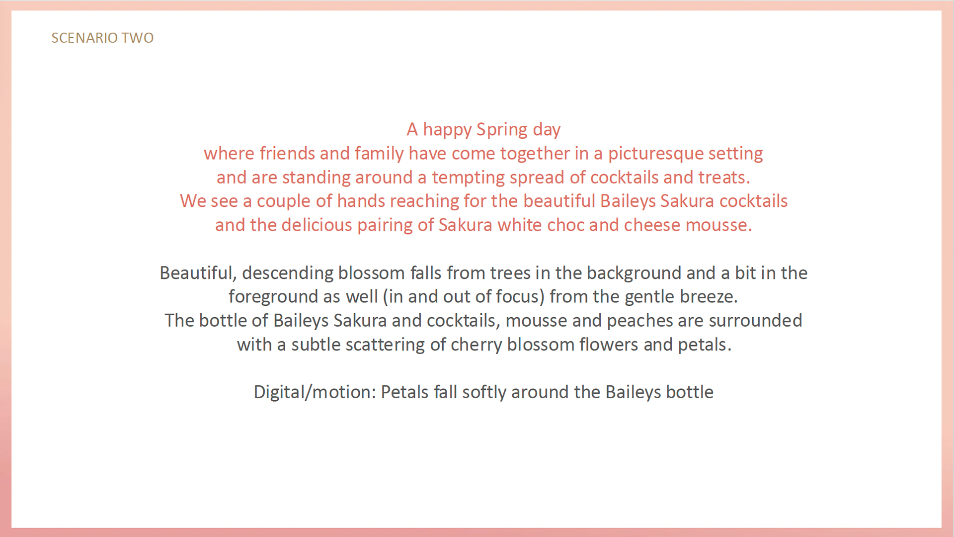 Below are the three routes presented, each exploring different ways of serving the drink alongside dessert pairings to highlight flavour cues in a range of social settings. The brief required the scenes to be outdoors—neither fully public nor private—capturing moments that felt both special and everyday. A key element throughout was the inclusion of cherry blossoms, bringing a delicate, signature touch to the visuals.