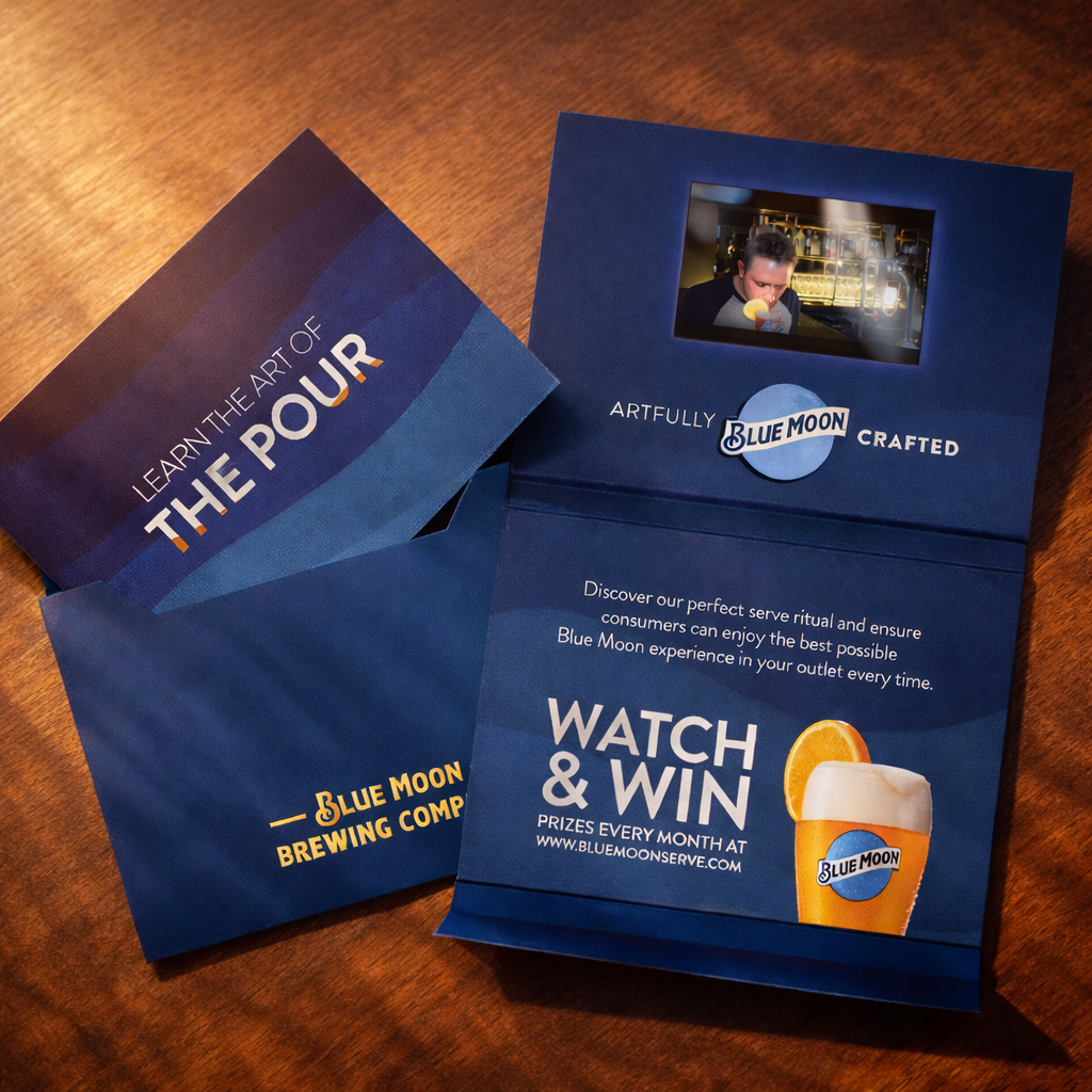 This B2B direct mail piece extends the campaign into the trade, translating brand theatre into practical education. An embedded video showcases Blue Moon’s perfect serve ritual—from the correct glassware to the iconic orange garnish—helping outlets deliver a consistently premium experience.