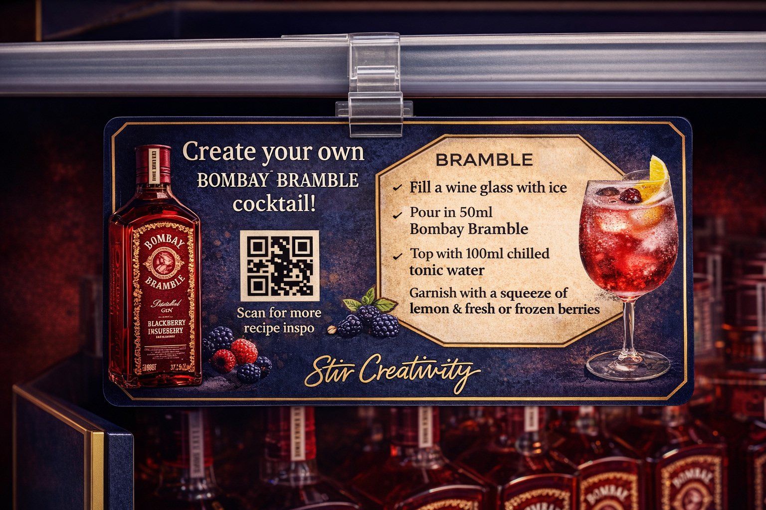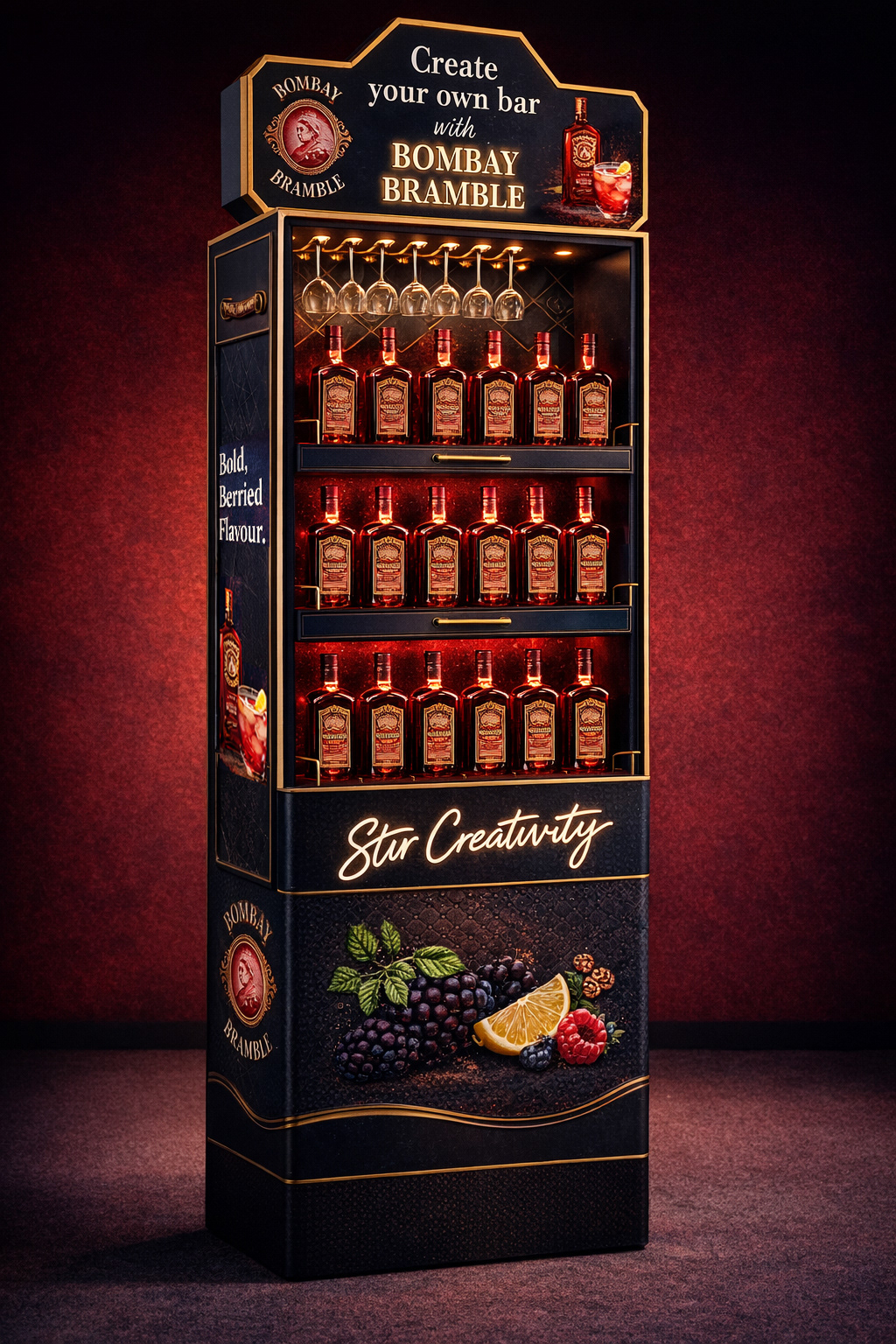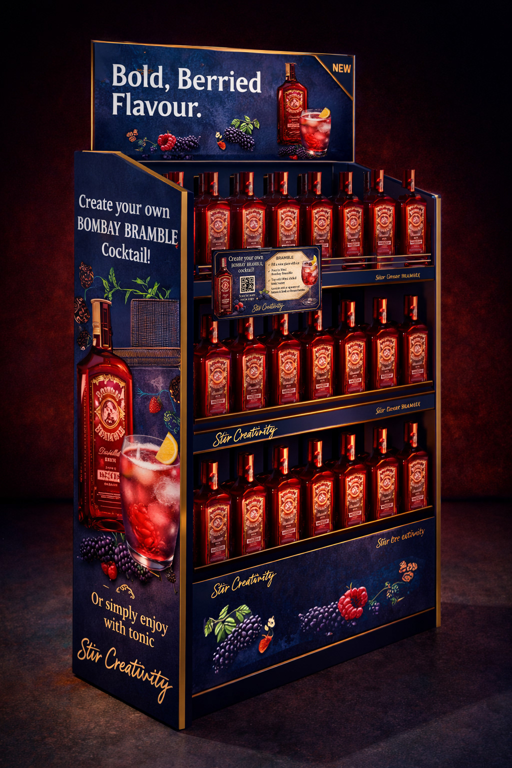 The Bronze, Silver, and Gold concepts form a scalable Bombay Bramble display system for supermarket retail. Designed as an in-store point-of-sale display styled to resemble a sophisticated drinks cabinet, the range reinforces Bombay Bramble’s premium positioning while encouraging shopper interaction and trial.