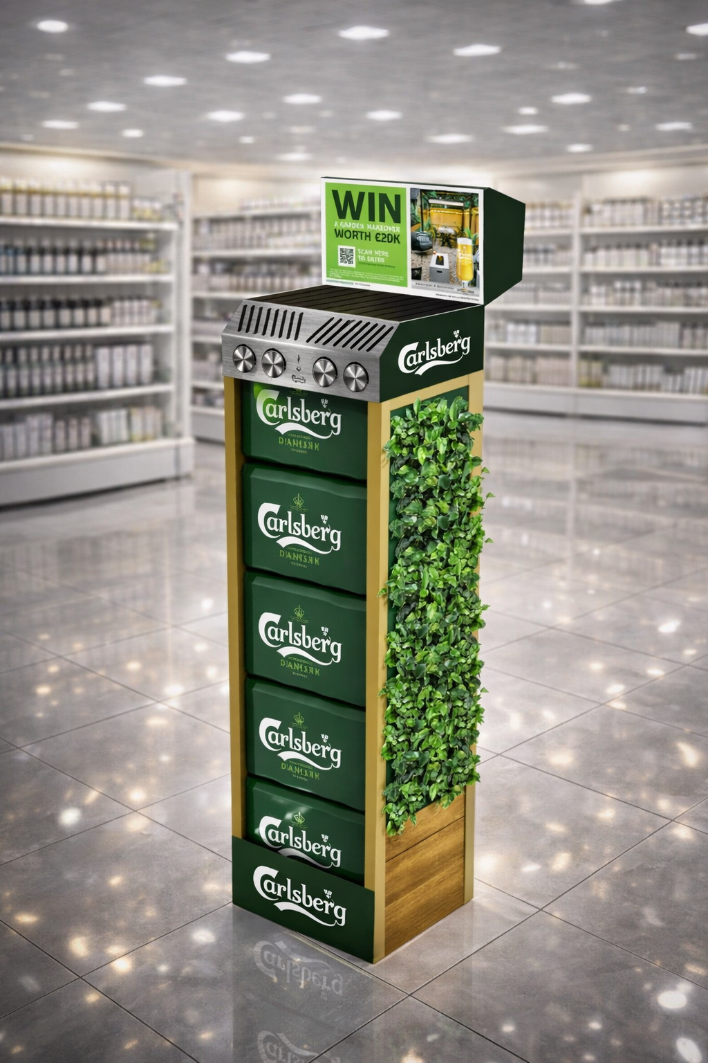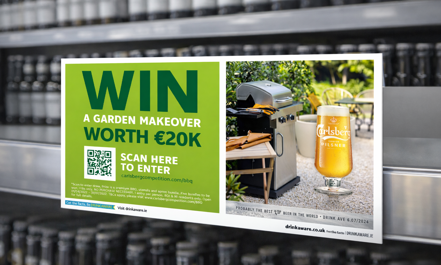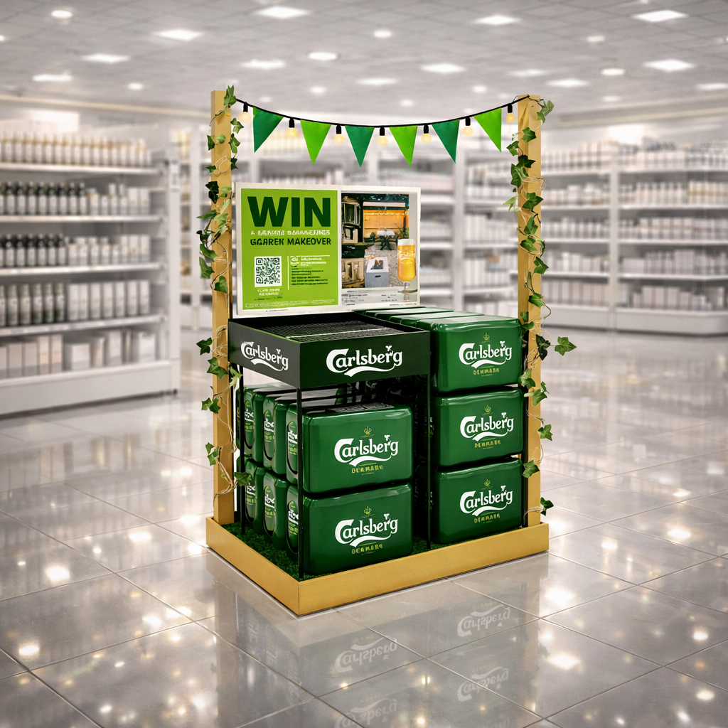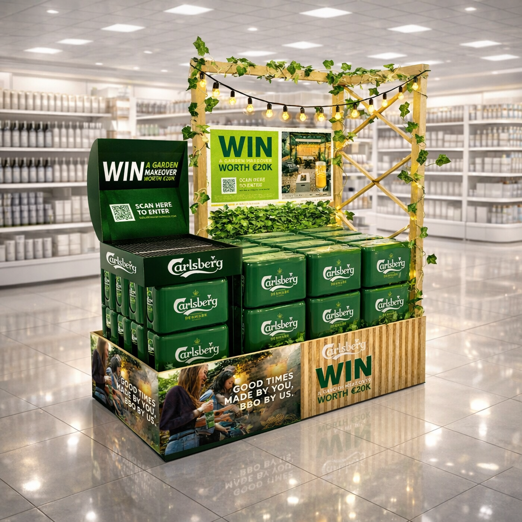 A fully integrated, garden-inspired in-store campaign spanning hero feature displays, secondary units and shelf-level POS. Designed to work at every retail touchpoint, the activation drove visibility, engagement and participation—clearly signposting the chance to win a €20k garden makeover while reinforcing Carlsberg’s association with premium outdoor moments and social occasions.