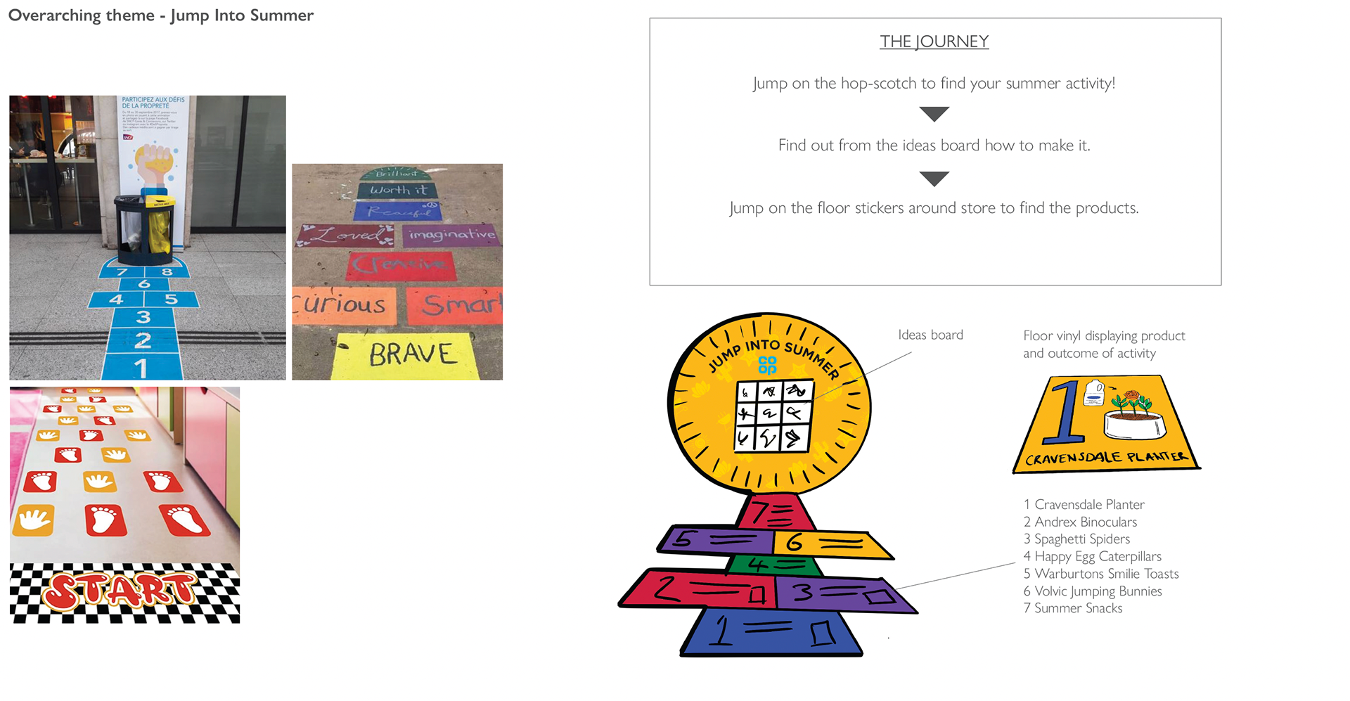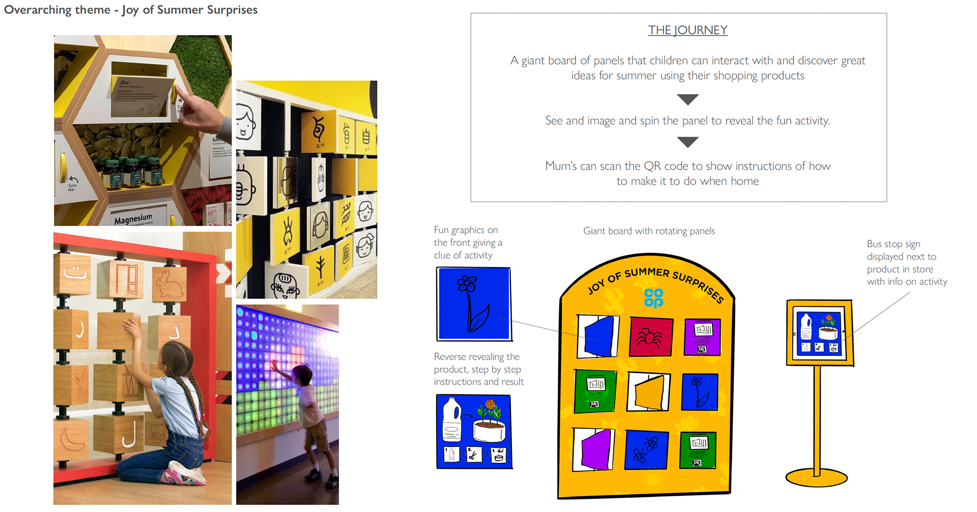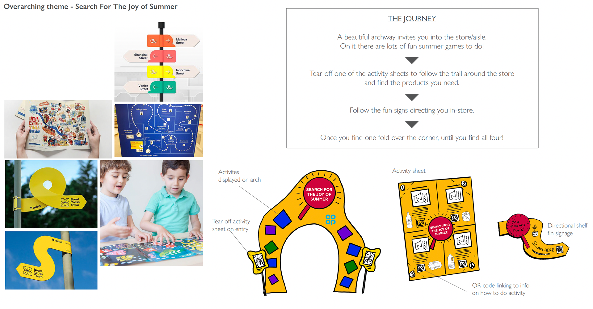 A fun, interactive in-store game was developed for Co-op shoppers with children, designed to encourage families to explore the store while discovering a range of summer products. Four creative routes were explored, each offering a different way to engage shoppers through play. Shown below, each route is brought to life with mood boards, shopper journeys, and annotated scamps, demonstrating how the experience turns everyday shopping into a memorable summer adventure.