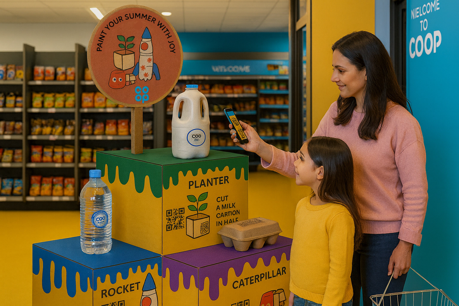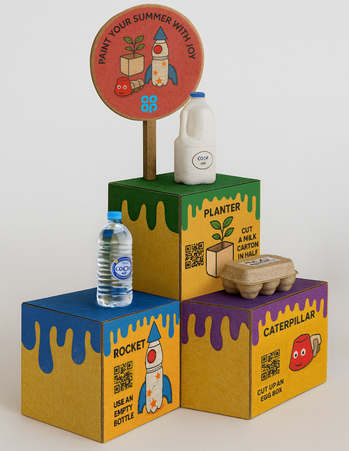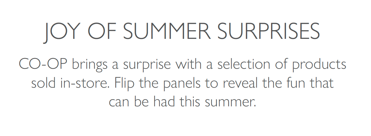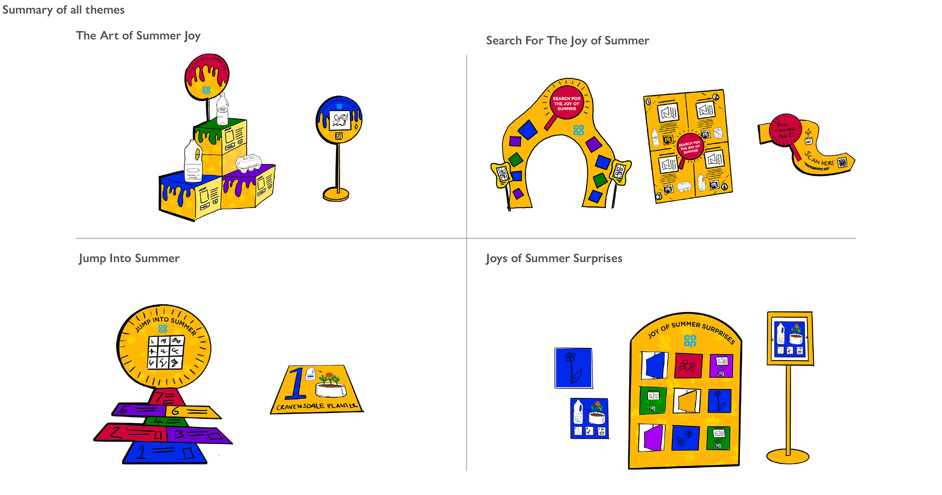 A fun, interactive in-store game was developed for Co-op shoppers with children, designed to encourage families to explore the store while discovering a range of summer products. Four creative routes were explored, each offering a different way to engage shoppers through play. Shown below, each route is brought to life with mood boards, shopper journeys, and annotated scamps, demonstrating how the experience turns everyday shopping into a memorable summer adventure.