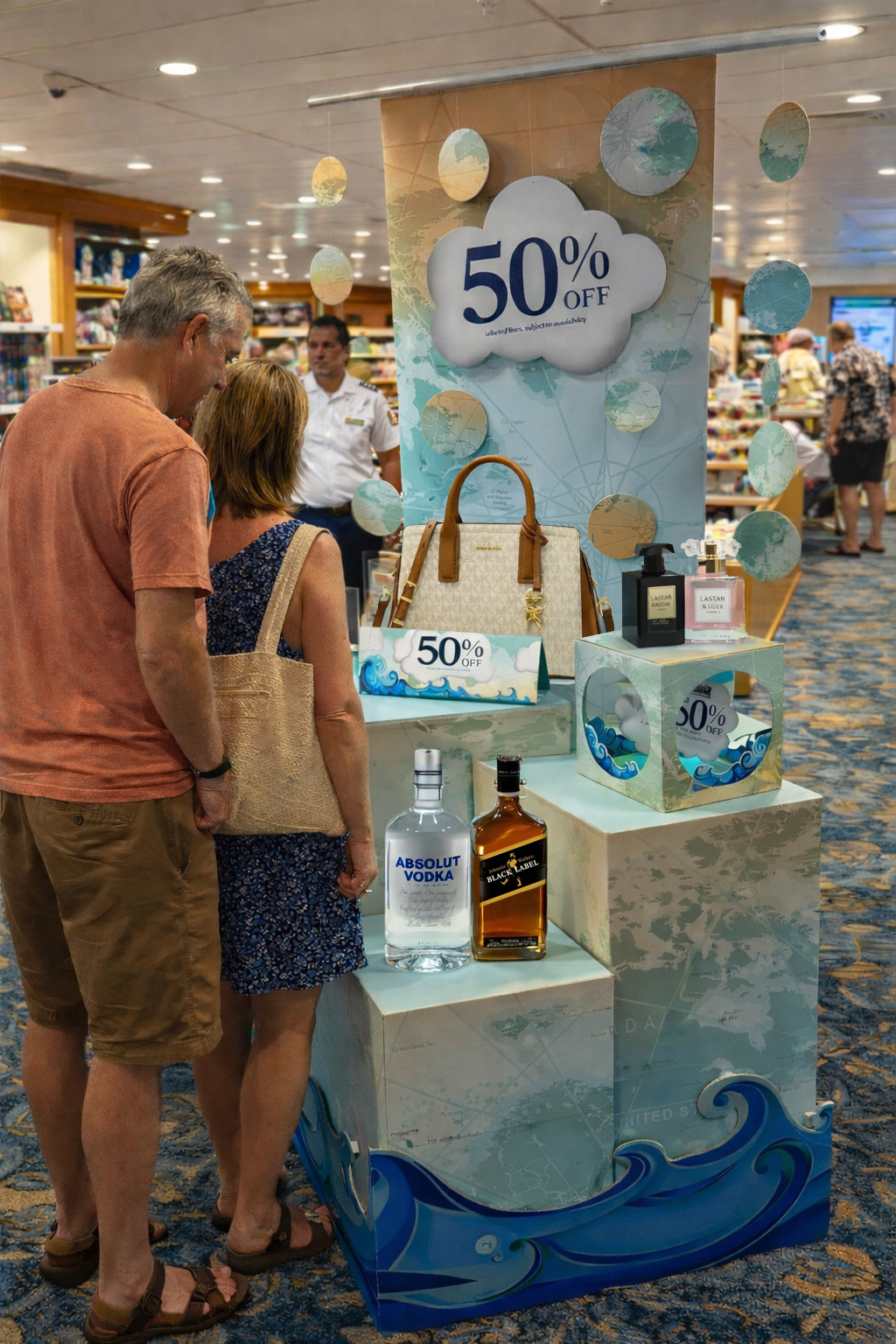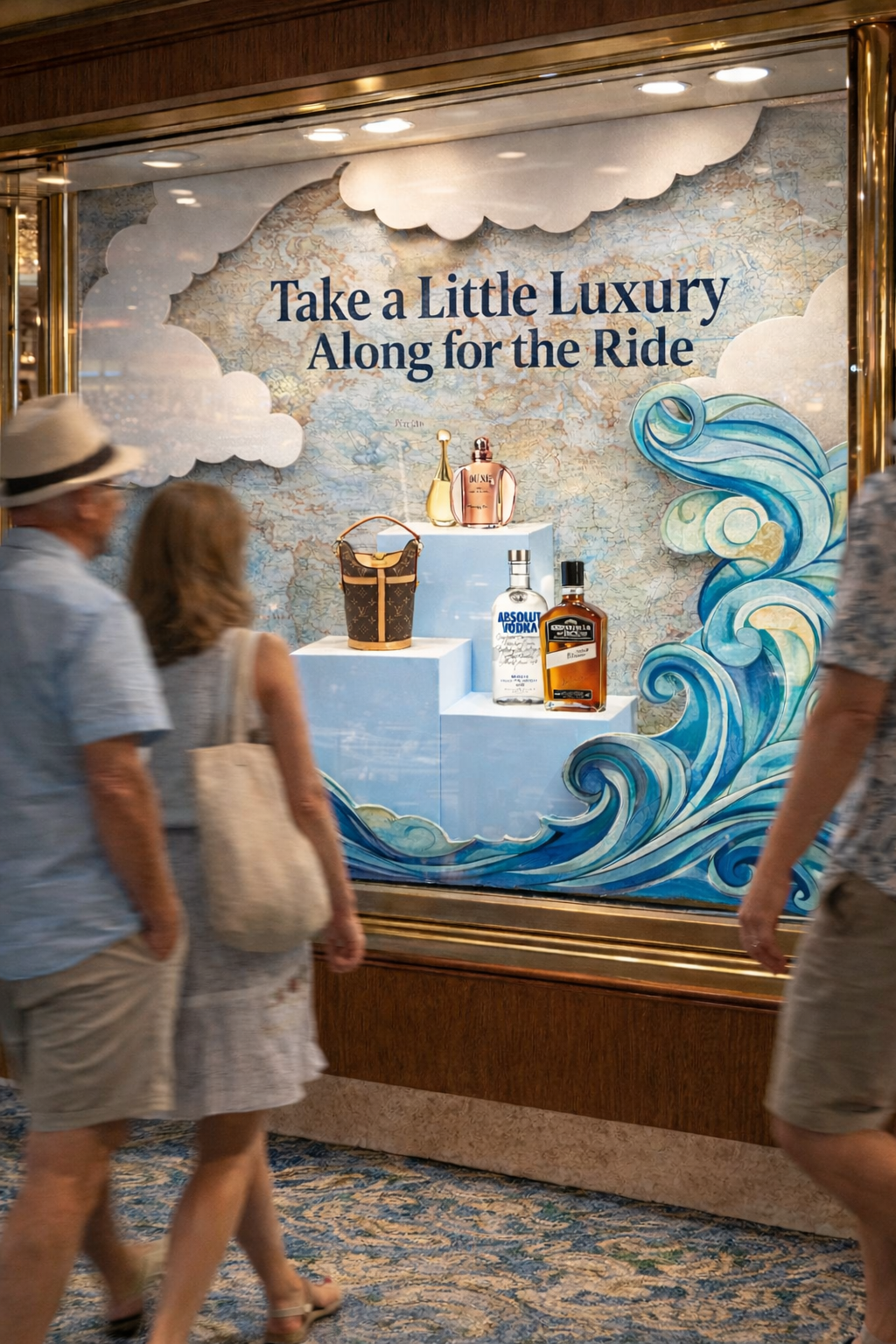 Together, the displays draw guests in from the promenade, increase dwell time in store, and elevate onboard retail into an aspirational, experience-led moment within the cruise journey.