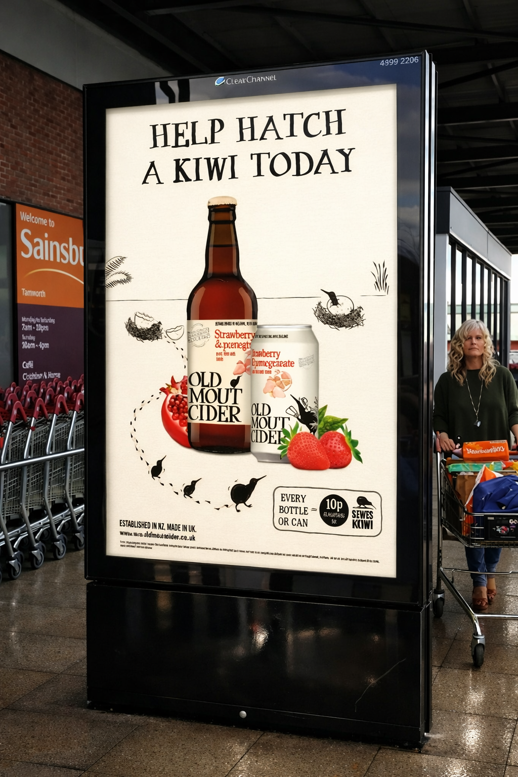 Developed a 360° campaign for Old Mout Cider with the theme “Help hatch a kiwi today”. Every can purchased contributed 10p towards kiwi conservation, combining engaging visuals, in-store activations, and digital content to raise awareness, encourage purchase, and connect consumers with the brand’s sustainability mission.