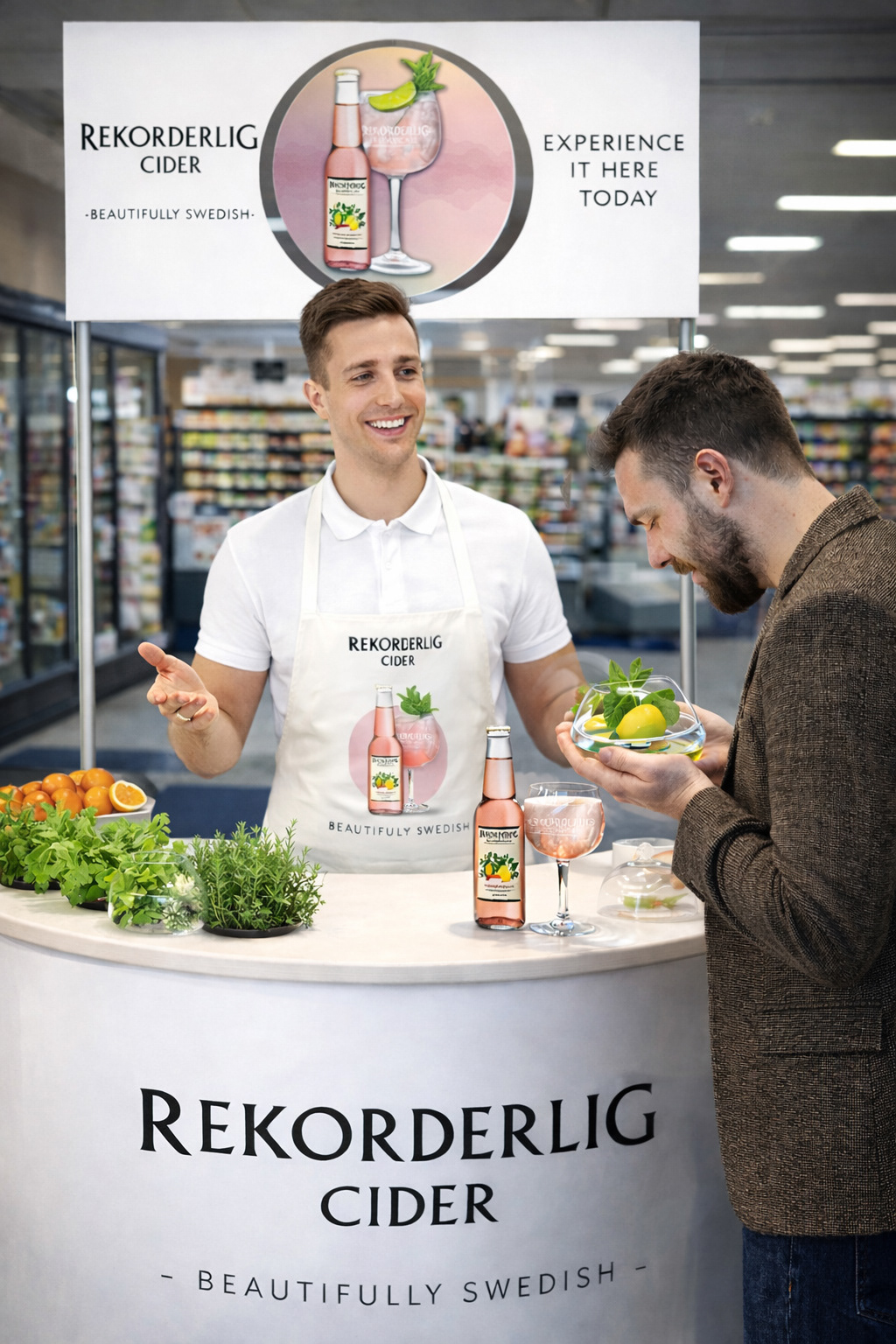 A premium in-store sampling concept designed to educate, inspire and convert. A Rekorderlig brand ambassador guided shoppers through the flavour range, showcasing perfect garnish pairings with fresh ingredients before directing them seamlessly to purchase—transforming tasting into an engaging, confidence-building brand moment.