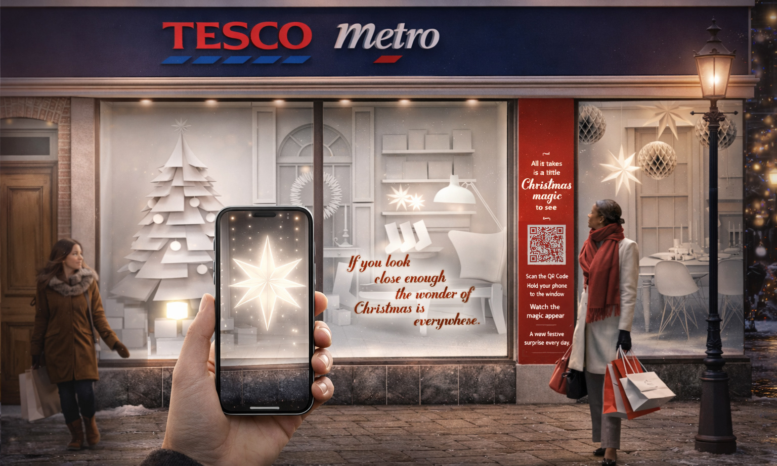A newspaper front page and Facebook launch that amplified Tesco Metro’s WebAR Advent window, transforming a festive storefront into a newsworthy moment that drove curiosity, engagement and repeat visits across December.