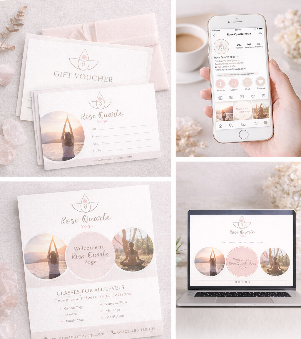 A calm, cohesive brand application for a boutique yoga studio, bringing the Rose Quartz Yoga identity to life across vouchers, website, Instagram, and printed leaflets. Soft colour, minimal layouts, and considered typography create a warm, premium feel that reflects the restorative nature of the practice.