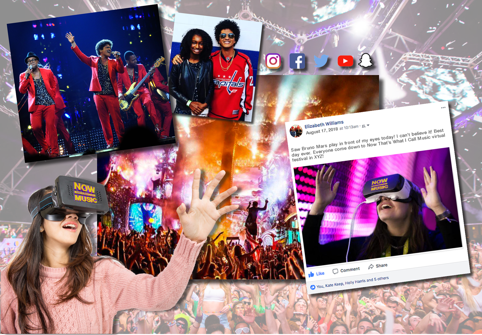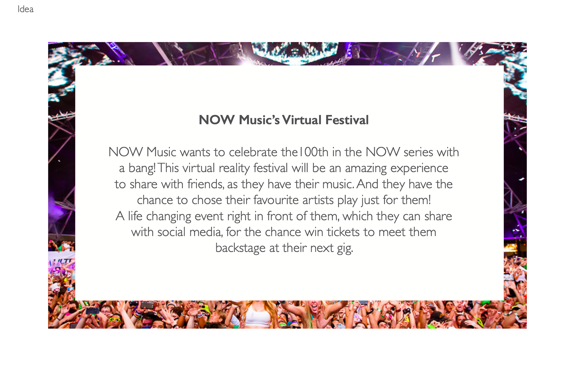 Developed event concepts for NOW Music to celebrate the 100th edition in the series, creating a festival-style live experience. The activation combined immersive visuals, interactive features, and curated music moments to deliver a memorable, energetic celebration that honored the milestone while engaging and delighting attendees.