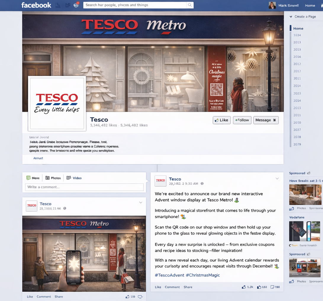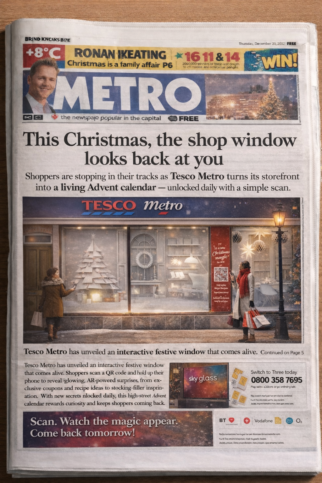 A newspaper front page and Facebook launch that amplified Tesco Metro’s WebAR Advent window, transforming a festive storefront into a newsworthy moment that drove curiosity, engagement and repeat visits across December.